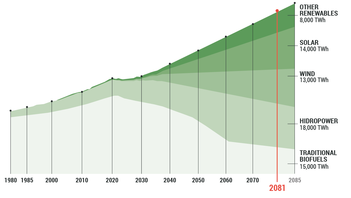 Energy production from fossil fuels historically peaked between 2020 and 2030, and then declined inexorably in favor of renewables.