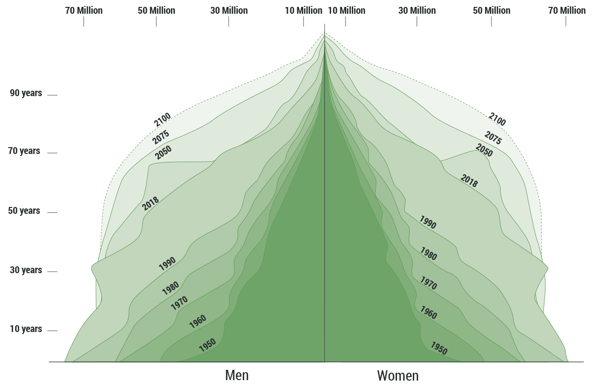 The age and gender distribution of the world's population from 1950 to 2080 and the United Nations Population Division's projections to 2100.